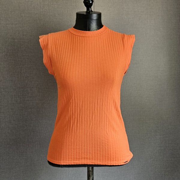 O canelado não só proporciona um visual moderno, mas também garante um caimento ajustado e flexível, enquanto a meia gola adiciona um detalhe elegante que diferencia a peça das regatas tradicionais. A cor laranja radiante traz um toque de frescor e vitalidade