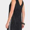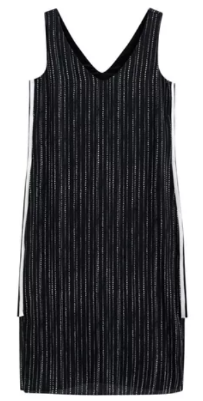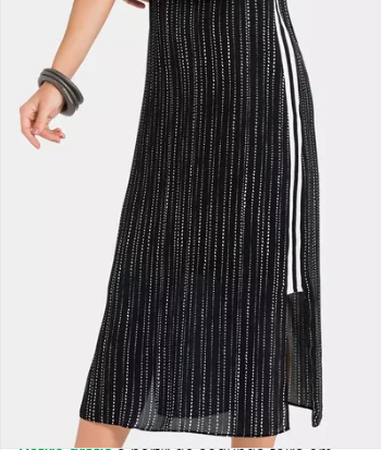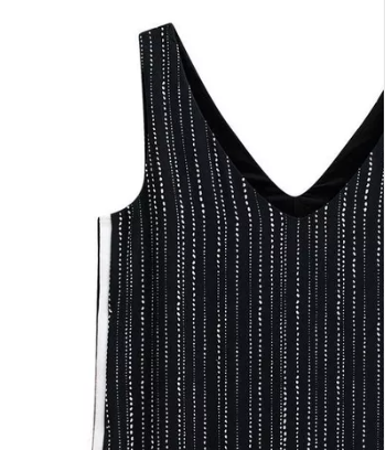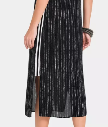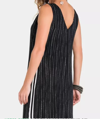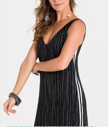 Este vestido midi possui uma modelagem reta e regata na parte superior, o decote em V valoriza o colo, enquanto a estampa de mini bolinhas brancas sobre o fundo azul (quase preto) traz um charme delicado à peça. Um detalhe especial é a faixa lateral retilínea com listras preta e branca, que adiciona um contraste moderno e estiloso. O vestido é inteiramente forrado, garantindo maior conforto e um acabamento impecável. Perfeito para compor looks elegantes e descontraídos.
