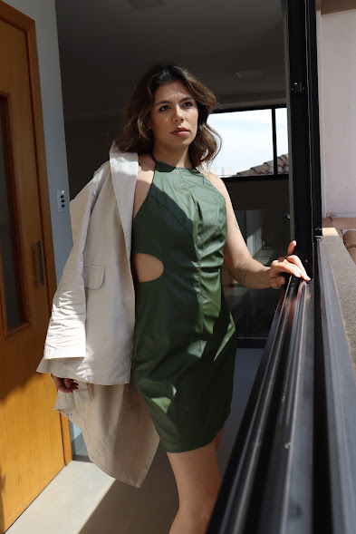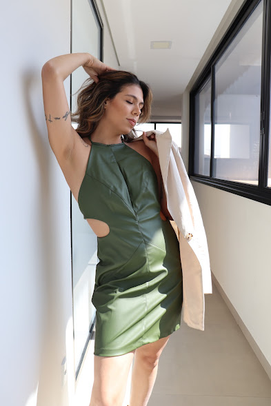 Vestido Curto em couro Fake, possui fechamento por zíper e tiras fixas para amarração. Barra com acabamento pespontado simples. Não possui forro.